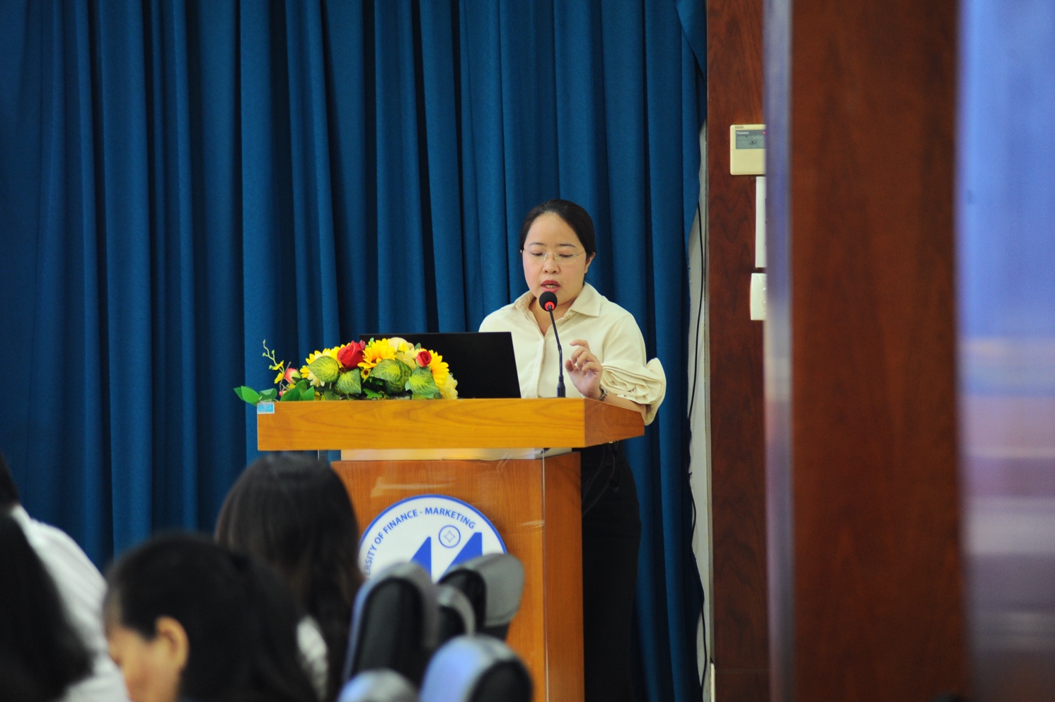 ThS. Nguyễn Trần Tú Anh – hoa Thương mại và Du lịch trình bày tham luận “Đổi mới phương pháp hướng dẫn và đánh giá kết quả thực tập nghề nghiệp cho sinh viên Ngành Kinh doanh quốc tế bằng giải pháp tích hợp trí tuệ nhân tạo và hồ sơ năng lực điện tử (e-portfolio)”