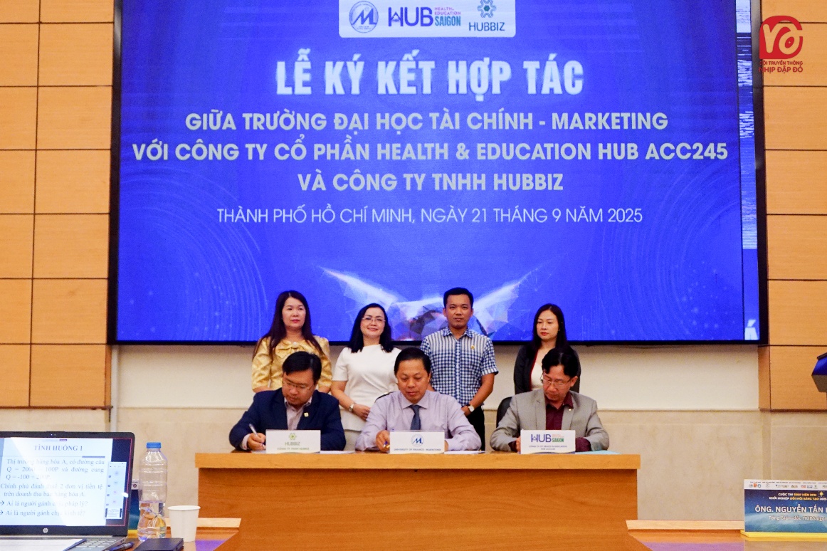 Tại chương trình cũng đã diễn ra Lễ kí kết giữa Công Ty TNHH Hubbiz, Công ty cổ phần Health & Education Hub Acc245 (HUBSAIGON) và trường Đại học Tài chính – Marketing hoạt động thể hiện việc cam kết đồng hành, hỗ trợ và chia sẻ nguồn lực nhằm tạo điều kiện cho các ý tưởng khởi nghiệp tiềm năng được phát triển thực tế.